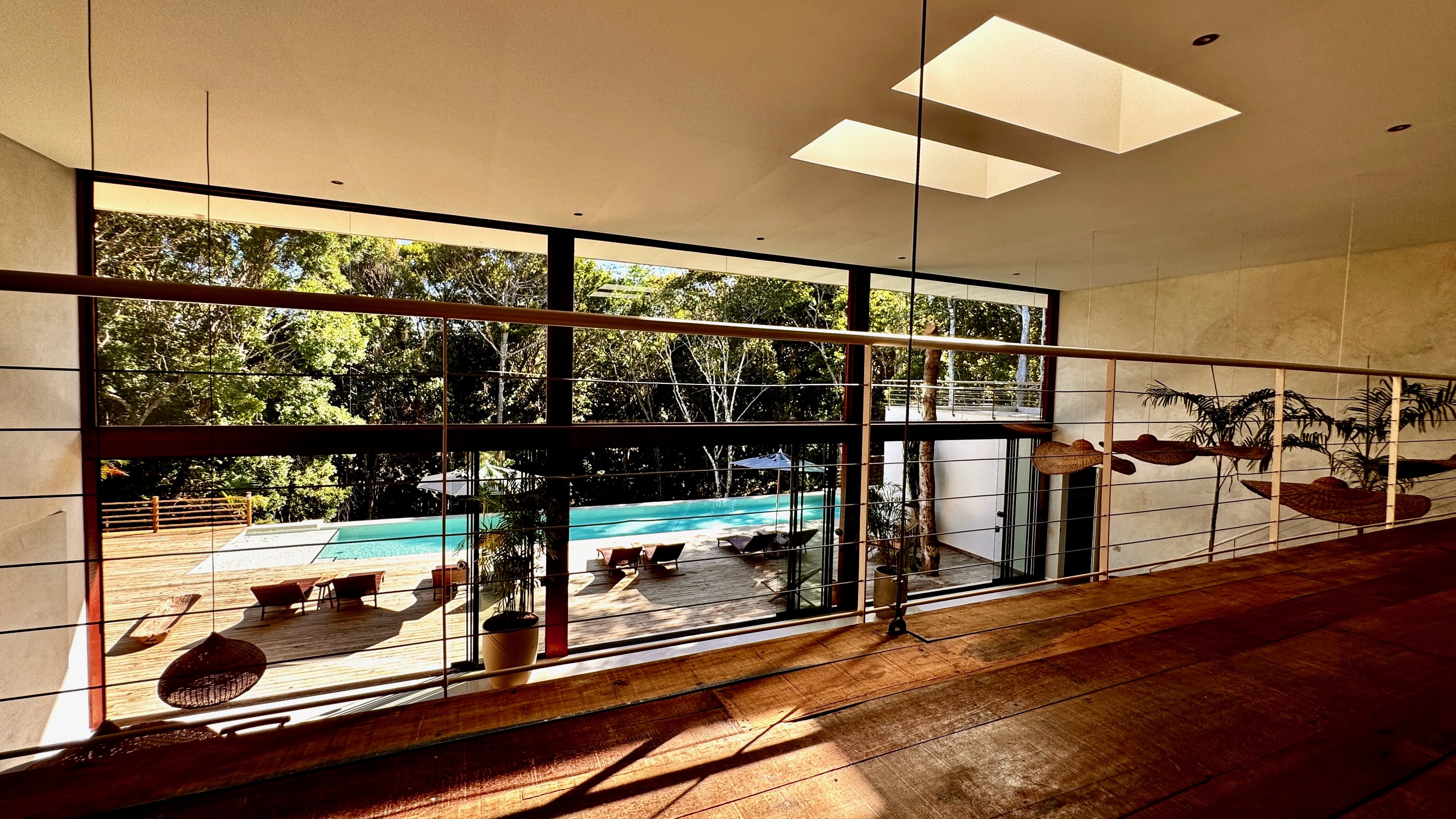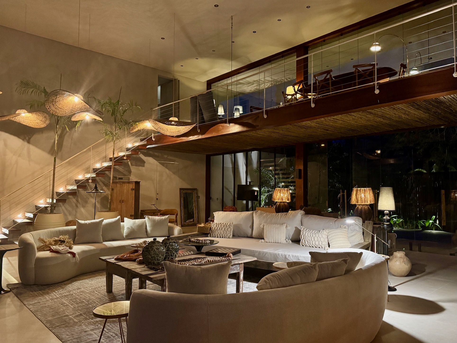 A casa revela um grande living com pé-direito duplo, onde o ar e a luz se tornam protagonistas. O design combina rústico sofisticado com minimalismo contemporâneo, criando uma estética sensorial, elegante e naturalmente teatral.