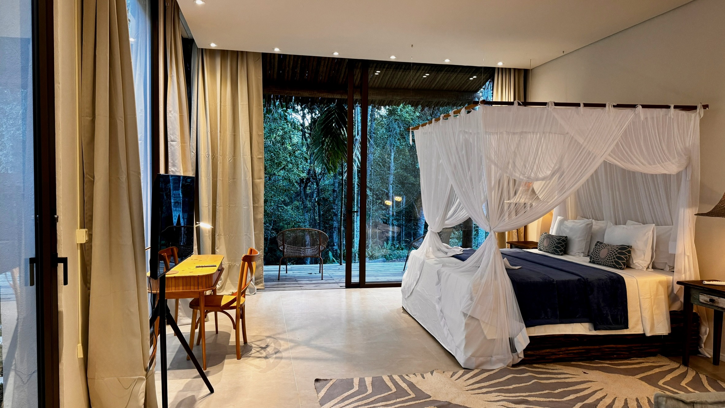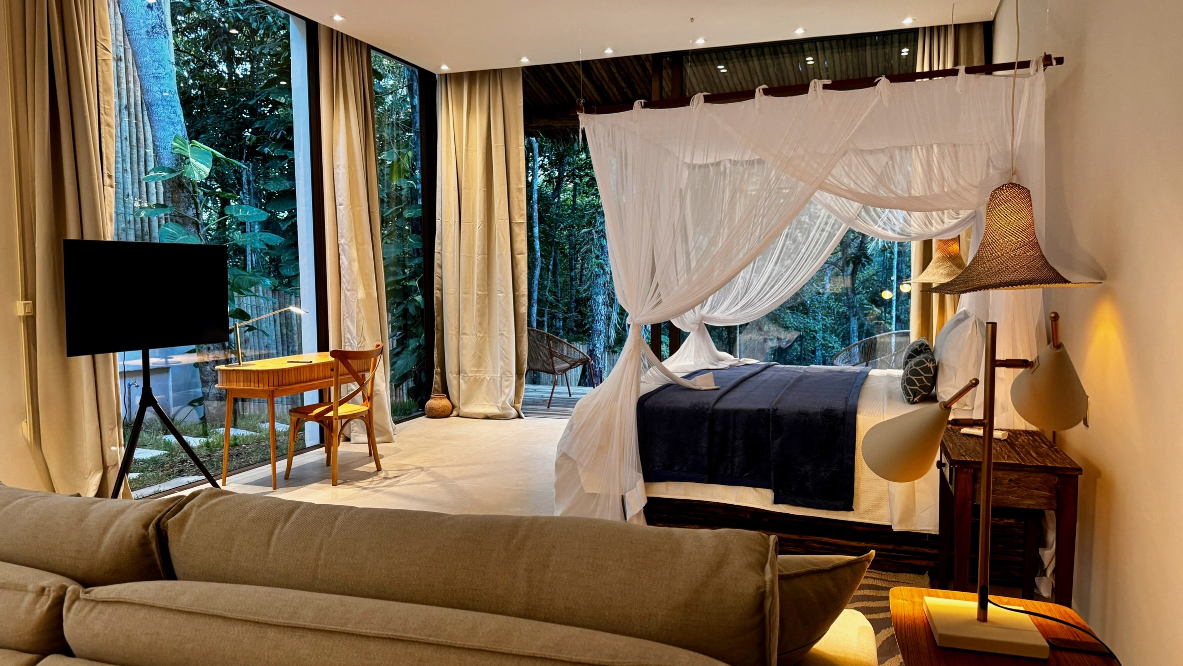 A spacious bangalô, suspended amidst tropical foliage, with rustic essential design.
