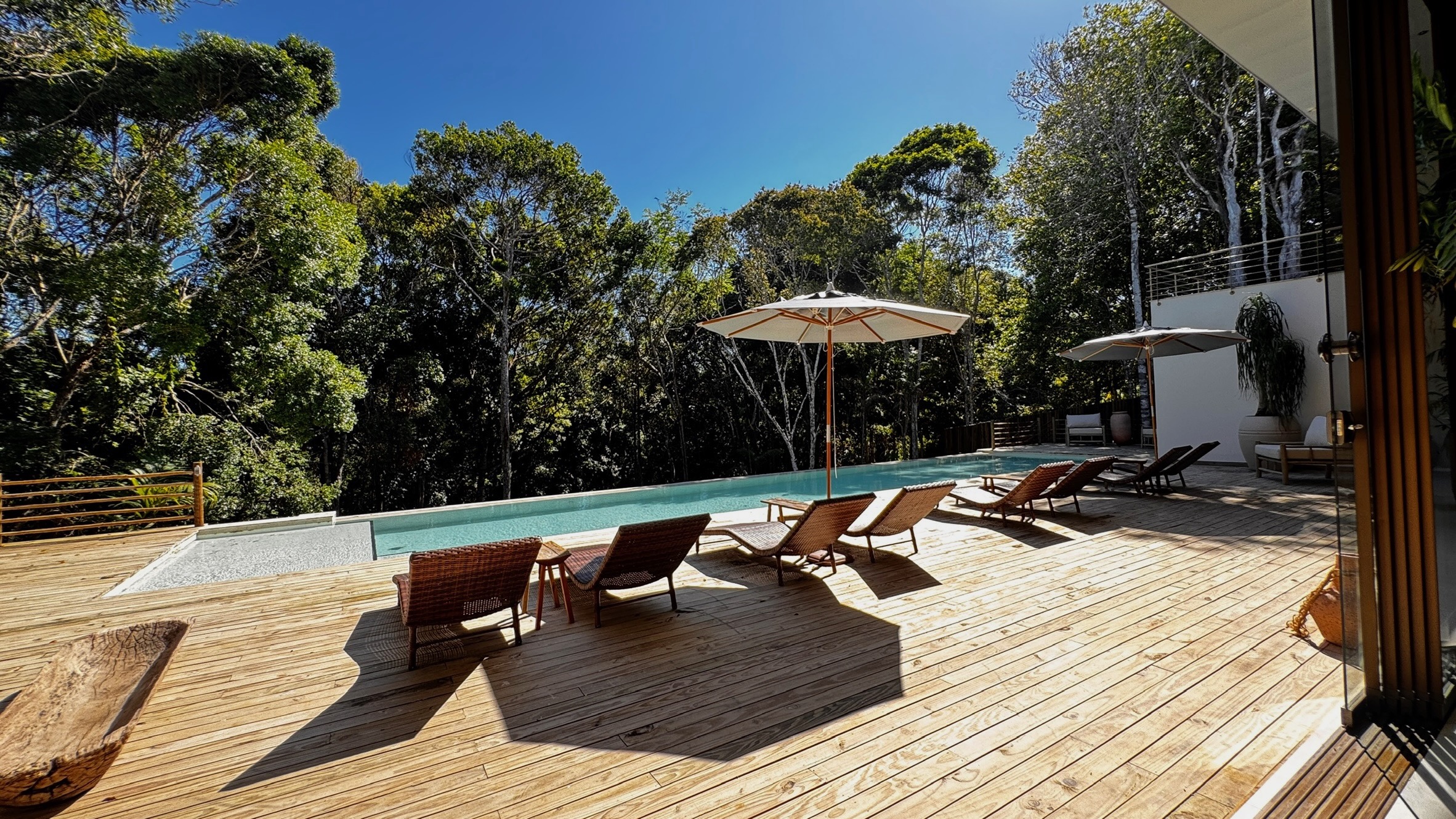 A piscina de 20 m x 3,80 m, com borda infinita, enquadra a mata preservada como um quadro vivo. Possui 8 pontos de hidromassagem, criando um espaço de imersão, relaxamento e contemplação.