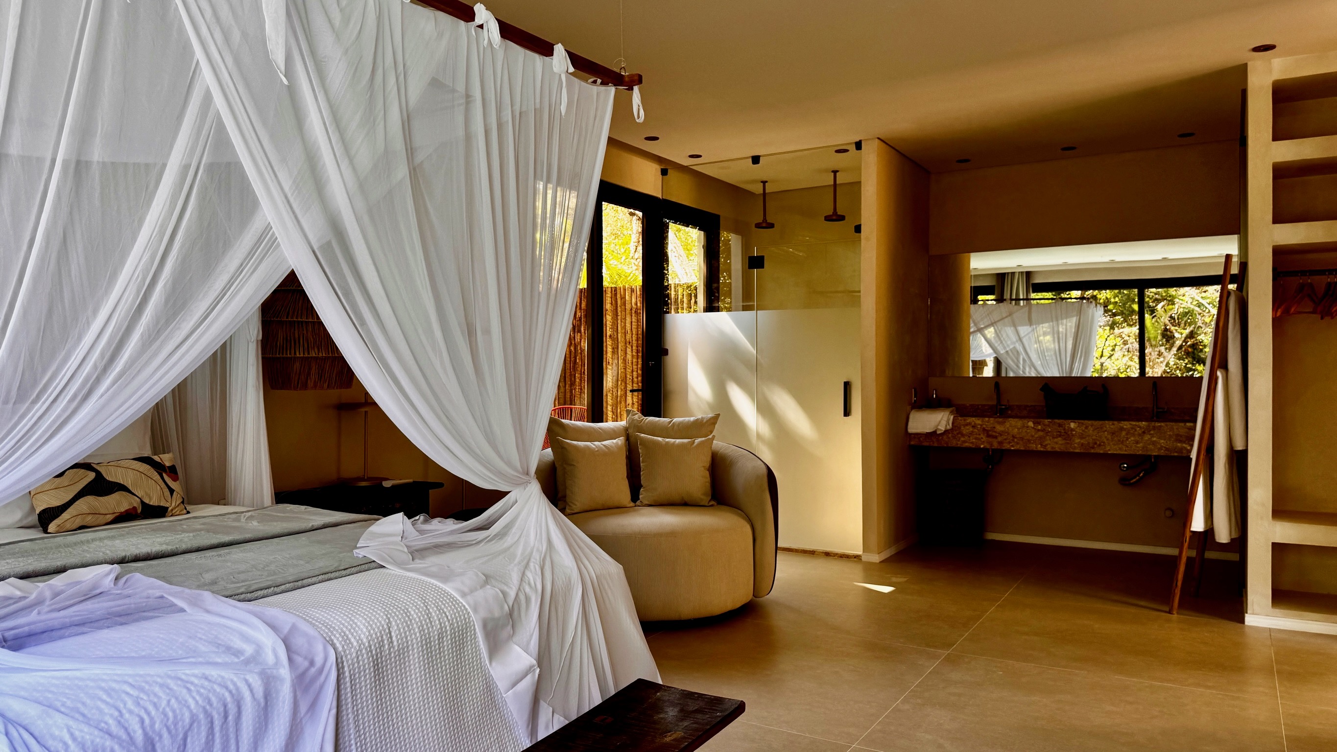 Large living, with a fully equipped kitchen and 2 suites with their own bathrooms. Larger suite has beautiful windows over looking tropical vegetation, smaller room has no view but immediate access to an open air living and common garden with nearby our largest pool. Ideal for families and friends.